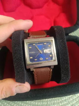 Reloj de pulsera Seiko con movimiento automático. - Esfera azul. - Correa de cuero marrón. - Ventana de día y fecha. Necesita servicio.
