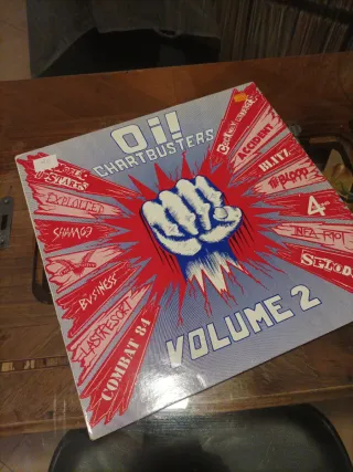 Vinilo recopilatorio Oi! Chartbusters Volume 2. Año 1987. Escucho ofertas. Si buscas algún vinilo especial pídemelo - Incluye temas de Angelic Upstarts, The Exploited, Sham 69, Cockney Rejects, Blitz, Infä Riot, y más. - Portada con diseño de puño y explosión de colores.