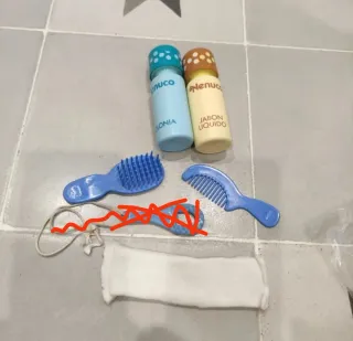 Set de canastilla para muñeco Nenuco de los años 70. Incluye varios accesorios. El bote de colonia tiene un pequeño desperfecto en el cuello y sí se puede abrir. El bote de jabón no se puede abrir. - Dos botes pequeños de colonia y jabón líquido. - Cepillo y peine. - Una braguita
