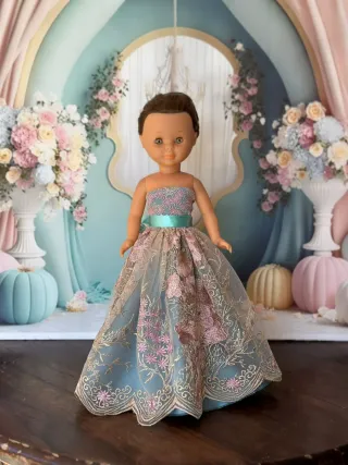 Vestido de flamenca para muñeca Nancy, con un diseño clásico de lunares blancos sobre fondo negro. - Diseño de lunares blancos. - Mangas con volantes y encaje. - Falda con múltiples volantes y encaje.muñeca y accesorios NO incluidos.
