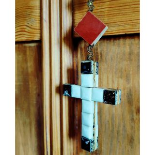 Gran rosario formado por cuentas de cerámica esmaltada o pequeños azulejos vidriados en tonos gris azulado y negro. Las cuentas están engarzadas con pasamanería en hilo de oro. Se utilizaba para colgar en la pared. Sólo le falta un azulejo contrapuesto al otro. Mide 112 cm de largo. EL ARTE DE REUTILIZAR PIEZAS CON HISTORIA. iglesia relicario escapulario virgen jesús misal santo casulla fraile monje cura practicante