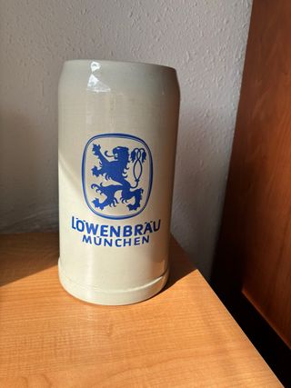 Jarra de cerveza de la marca Löwenbräu de Múnich. Diseño clásico con el emblema del león. - Material: Cerámica. - Color: Beige. - Diseño: Emblema azul del león y texto LÖWENBRÄU MÜNCHEN.