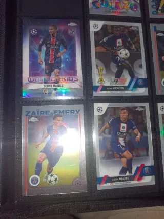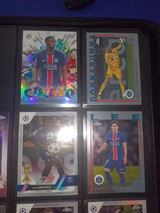 Lote de cartas de fútbol Topps Chrome del Paris Saint-Germain (PSG). - Carta de Ousmane Dembélé golazo. - Carta de Gianluigi Donnarumma. - Carta de Nuno Mendes (Future Stars). - Carta de Kang-In Lee. - Mayulu wonderkids rc. - Mbappe, entre otros