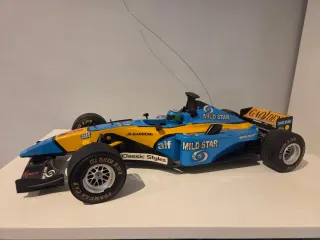 Coche teledirigido de Fórmula 1 Renault R23, modelo que compitió en la temporada 2003. - Detalles de patrocinadores como Mild Star y Elf. - Neumáticos de goma con banda de rodadura. - Antena de control remoto visible. - Funciona, pero aveces no va marcha alante, solo gira y atrás. - Dos roedas de recambio. - Cargador. - Medida 58cm largo x25cm ancho x17cm alto. - Perfecto como colección.