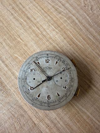 Maquinaria cronografo de reloj de la marca Dogma, modelo Landeron 51. Pieza de repuesto o para coleccionistas. En buen estado general como se ve en las imagenes, el volante hace marcha y mueve los mecanismos, se vende para repuestos o restaurar como piezas le hace falta mantenimiento y una caja - Esfera con números arábigos y marcadores. - Subesferas para cronógrafo. - Bisel con escala taquimétrica.