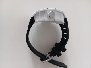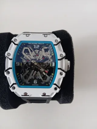 Elegante reloj con caja de carbono y detalles en azul. - Diseño deportivo y moderno. - Esfera esqueletizada. - Correa de caucho. - Fabricado en Suiza.