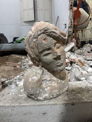 Busto de estatua encontrado en una casa antigua. La pieza tiene un acabado rústico y detalles únicos. - Material: Arcilla y cemento. - Estilo: Clásico. - Dimensiones aproximadas: Alto 40cm, Ancho 25cm.