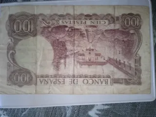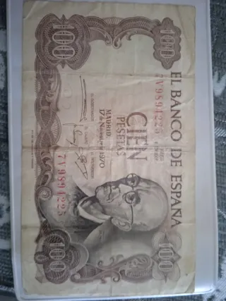 Billete de 100 pesetas del Banco de España, emitido en Madrid el 17 de noviembre de 1970. - Serie V. - Número de serie: 7V9894225. - Diseño con retrato de personaje histórico.