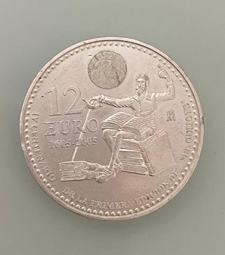 Moneda conmemorativa de 12 euros del año 2005, dedicada al IV Centenario de la primera edición de El Quijote. - Material: Plata. - Valor facial: 12€. - Año de emisión: 2005. - Diseño: Representa a Don Quijote y el IV Centenario de El Quijote.