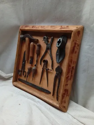 Conjunto de herramientas antiguas de zapatero, presentadas en un marco de madera. - Martillo de zapatero - Tijeras - Punzón - Compás - Tenazas - Formón - Troqueladora - Lastre de zapatero - Horma de zapato