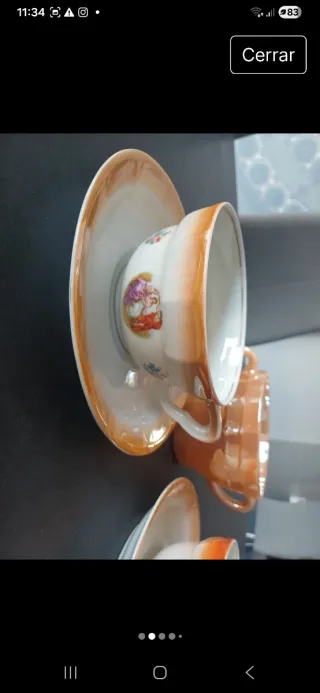 Conjunto de 2 tazas y platos de porcelana con un diseño vintage. - Borde con acabado naranja y detalles florales. - Ideal para coleccionistas o para añadir un toque retro a tu hogar. - Juego de 2 tazas y platos con azucarero en mismo color