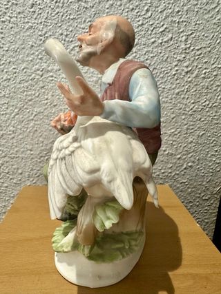 Figura de porcelana vintage que representa a un anciano con una oca. - Detallada figura de porcelana. - Diseño vintage. - Bien conservada.