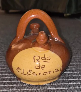 Pequeño botijo de cerámica con inscripción. - Inscripción: Rdo de El Escorial - Color marrón y crema.