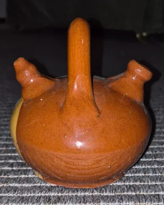 Botijo de cerámica con un diseño tradicional y colorido. Ideal como pieza decorativa. - Cerámica pintada a mano. - Motivos florales amarillos y rojos. - Tres picos decorativos.