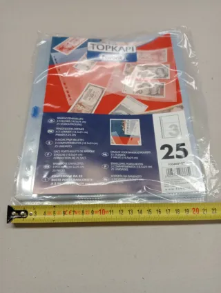 Protege tus billetes con estas fundas transparentes. - Material plástico. - Diseñadas para coleccionismo. - 18,5 x 24 No es tamaño folio.