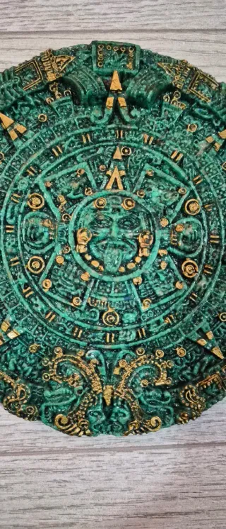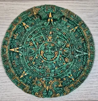 Réplica detallada del Calendario Azteca, también conocido como la Piedra del Sol. Presenta un diseño intrincado con acabados en verde y dorado. - Diseño inspirado en el arte azteca. - Detalles en relieve. - Color verde con acentos dorados.