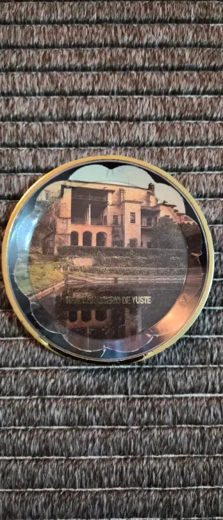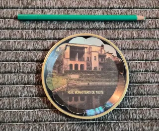 Platito decorativo con imagen del Monasterio de Yuste. - Diseño circular con borde dorado. - Imagen del Monasterio de Yuste. - Texto REAL MONASTERIO DE YUSTE impreso.