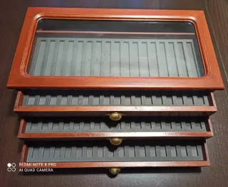 Expositor de madera con tapa de cristal y cajones para colecciones. - Estructura de madera. - Tapa de cristal. - Tres cajones con compartimentos para 51 Plumas. - Medidas: 40 x 20 x 14 cm.