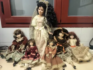 Lote de muñecas de porcelana antiguas de distintos tamaños (aprox. de 25 a 45 cm). Estado general irregular, propio del paso del tiempo: – Vestidos con suciedad y amarilleamiento. – Peinados deteriorados. – Son base, excepto la más grande. – Una muñeca grande presenta falta de una mano (ver fotos). -Se venden todas juntas, no se separan. Ideales para restauración, decoración, atrezzo o manualidades. -Entrega en mano.