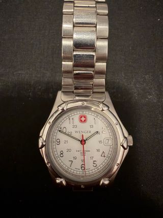 Elegante reloj de pulsera de la marca Wenger, con un diseño SMT y fabricado en acero en Suiza. Mod. 095.0695 - Esfera blanca con números arábigos. - Indicador de fecha. - Resistencia al agua de 100 metros. - Correa de acero. - Movimiento Ronda de cuarzo suizo. - Caja acero inixidabke pulido de 38 mm contando corona. 35 mm sin corona. - Tapa de presion con incripciones de la marca y simbolo navaja suiza. - Funciona perfectamente.