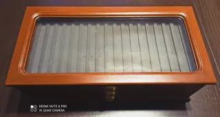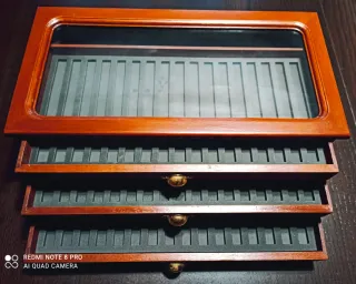 Expositor de madera con capacidad para 51 plumas. Ideal para coleccionistas. - Estructura de madera oscura. - Tres cajones extraíbles. - Compartimentos individuales para cada pluma. - Tapa de cristal para visualización. - Medidas: 40 x 20 x 14 cm.