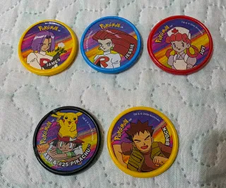 Colección de 5 tazos de Pokémon de la serie Master Tazos de principios de los 2000, todos en perfecto estado excepto el de Ash & Pikachu que tiene un desperfecto como muestro en la tercera foto. - Personajes: James, Jessie, Joy, Ash & Pikachu, Brock.