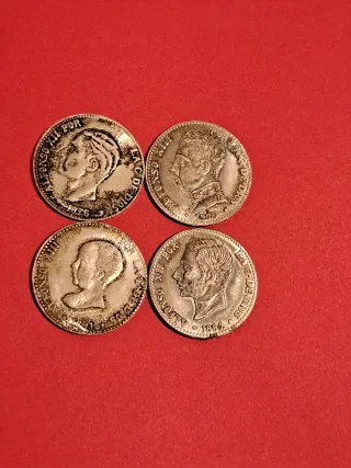 Conjunto de cuatro monedas 1 peseta réplicas reproducciones con la efigie de Alfonso XIII. - Diseño con Alfonso XIII por la gracia de Dios. - Años visibles: 1876, 1908, 1882 y 1891.