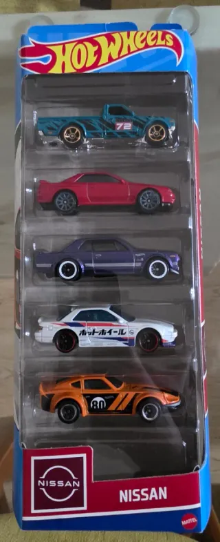 Pack de 5 coches Hot Wheels de la marca Nissan. Incluye varios modelos icónicos, en su empaque original, nunca abierto, se compró y solo ha estado expuesto, ideal para coleccionistas.