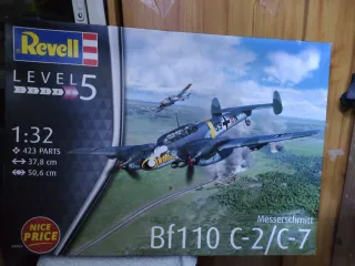 Maqueta a escala 1:32 del avión Messerschmitt Bf 110 C-2/C-7 de Revell. - Nivel de dificultad 5. - Incluye 423 piezas. - Dimensiones: 37,8 cm de largo y 50,6 cm de envergadura.