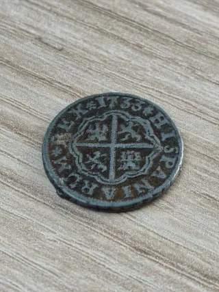 Moneda antigua conmemorativa de la Casa de Borbón, acuñada en el año 1733. - Diseño con escudo central. - Inscripción HISPANIA y 1733 visible.