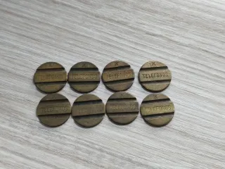Lote de 8 fichas de teléfono antiguas, utilizadas en cabinas telefónicas. - Diseño circular con inscripciones. - Fabricadas en metal. - Grabado TELEFONOS y una X.
