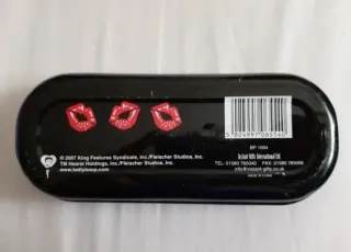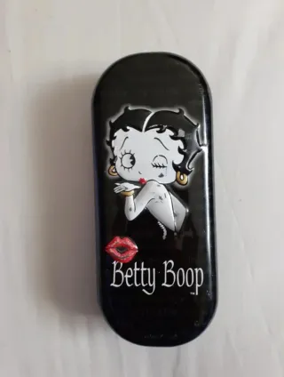 Estuche de metal con diseño de Betty Boop guiñando un ojo y lanzando un beso. - Diseño frontal de Betty Boop. - Acabado en color negro. - Detalles en rojo. Signos de uso y desgaste. Ver fotos