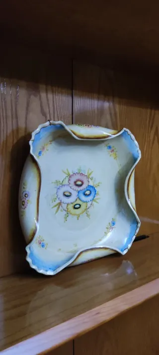 - Precioso plato decorativo de porcelana, ideal para añadir un toque de color a tu hogar. - Con diseño floral en centro y esquinas. - Pintado a mano. - Bordes irregulares y detalles en azul y dorado.