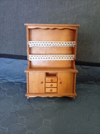 Mueble de madera para casa de muñecas, ideal para coleccionistas. - Diseño de dos estantes superiores con encaje. - Base con dos puertas y tres cajones centrales.