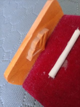 Cama doble para casa de muñecas, con estructura de madera y acolchado rojo. - Estructura de madera. - Superficie acolchada de terciopelo rojo. - Detalle decorativo en la cabecera.
