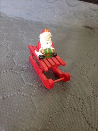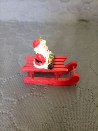 Adorno navideño de Santa Claus sentado en un trineo rojo, sosteniendo un regalo verde. - Figura detallada de Santa Claus. - Trineo de madera pintado de rojo. - Incluye un pequeño regalo envuelto.