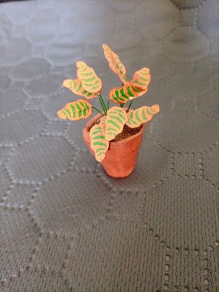 Pequeña planta decorativa para casas de muñecas o maquetas. - Maceta de terracota. - Hojas verdes y naranjas con diseño a rayas.