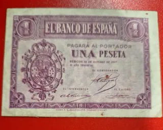Billete de 1 peseta del Banco de España, emitido en 1937. - Fecha: 12 de octubre de 1937. - Lugar de emisión: Burgos. - Impreso por COEN & C. BANCONOTE MILANO (ITALIA).