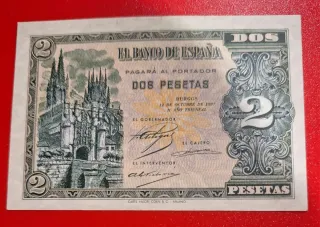 Billete de 2 pesetas del Banco de España, emitido en Burgos el 12 de octubre de 1937. - Serie A, muy escaso. - Diseño con la Catedral de Burgos. - Impreso por Carte Valori Coen & C. Milano.