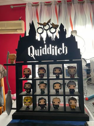 Estantería decorativa temática de Harry Potter, con diseño de Quidditch. - Silueta negra con detalles de castillo. - No Incluye figuras Funko Pop de personajes de Harry Potter (preguntar porque tengo algunos repetidos) - Parte superior con aros de Quidditch y Snitch dorada. - Edicion kinder joy aunque sirve para bitty pop