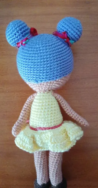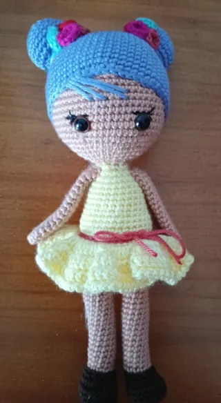 Muñecas artesanal tejida a mano con hilo. - Diseño de bailarina. - Vestido amarillo con detalle de lazo. - Pelo azul con adornos. - Ojos de seguridad. _ bailarina 12 euros. _ muñeca 18 euros Las dos por 25 euros