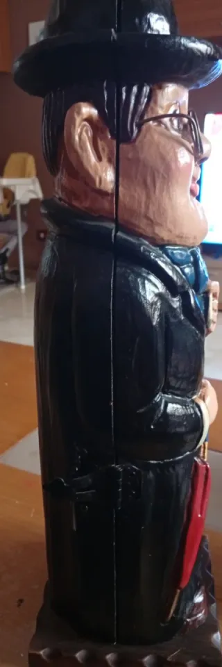 Original botellero tallado a mano en madera, con la figura de un hombre con sombrero, gafas y paraguas. - Detalle de bufanda azul. - Sostiene un cigarrillo en la mano. - Paraguas rojo plegado.