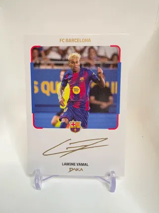 Tarjeta de colección de Lamine Yamal con autógrafo. - Incluye la imagen del jugador del FC Barcelona. - Firma dorada del jugador. - Nombre del jugador: Lamine Yamal. - Nombre adicional: Daka.