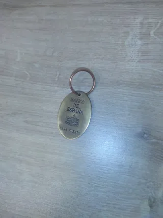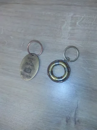 Dos llaveros de colección hechos de latón. - Llavero con forma ovalada con grabado BANCO DE ESPAÑA CAJA FUERTE, bonita pátina, auténtico, raro de encontrar. - Llavero con forma de salvavidas latón.