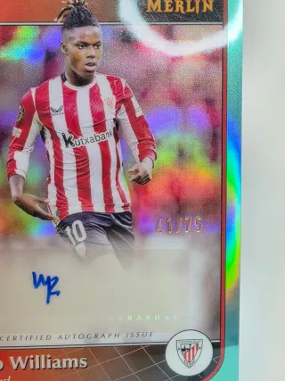 Tarjeta de colección de Nico Williams de Topps Merlin. - Edición limitada /75. - Autografiada. - Incluye el escudo del Athletic Club.