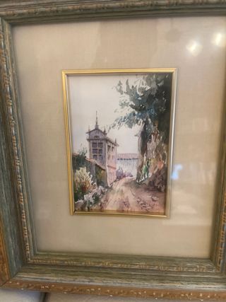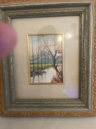 Preciosa pintura de paisaje realizada en acuarela. Representa un río serpenteante rodeado de árboles en tonos otoñales. - Marco de madera con detalles dorados y verdes. - Passepartout de color crema.