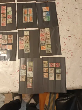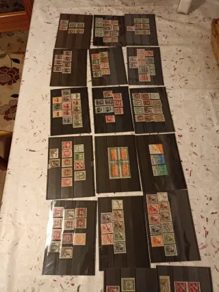 Lote sellos en fichas de españa.selloes locales de la guerra civil.series completas .sueltos . repetidos.variedades alto valor.todos se muestran en las fotos.sellos con fijasello.gracias