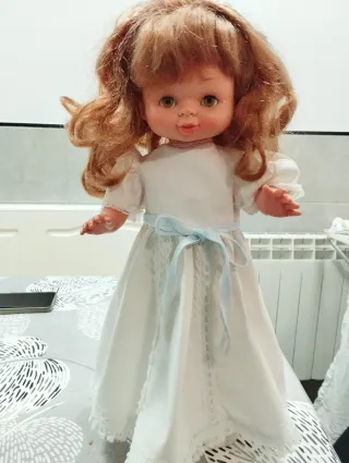 Muñeca clásica de la marca Famosa, con un vestido blanco y detalles en azul. Se mueve con pilas. - Vestido blanco con lazo azul. - Pelo largo y ondulado. - Ojos verdes. - Brazos y piernas articulados.