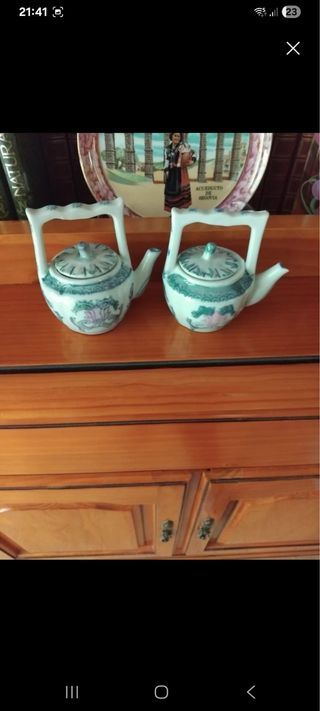 Conjunto de dos teteras decorativas con un diseño floral en tonos verdes y rosas. - Diseño floral. - Acabado en cerámica.