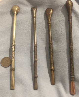 Conjunto de cuatro bombillas antiguas para mate. Cada una presenta un diseño y acabado único. - Materiales metálicos variados. - Diseños ornamentales y lisos. - Piezas de colección.